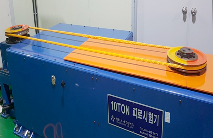 This test is to analyze deformation and damage that occur in repetitive use of fiber ropes after reenacting various environmental condition with cyclic loads. During the process, a broken mechanism is examined in several conditions such as repetitive bending, stretch and friction etc.. The test procedures for TCLL(Tension Cycle Load Limit) can also enable us to check maximum allowable load in each cycle and evaluate the stability of long-term use and performance for fiber ropes.